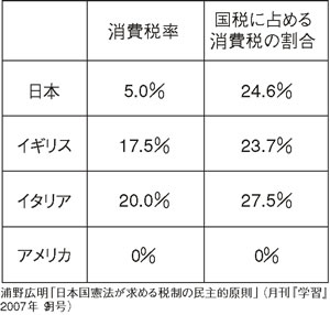 「日本の消費税は安い」という議論にもごまかしがあると浦野さん。税率は低くても、国の税収に占める比率では、イギリスなどと同水準(表4)。こうなってしまうのは、日本の消費税がほとんどの商品にかかる「一般消費税」だからです。イギリスでは食料品や医薬品、書籍、旅客運賃、住宅建設、子ども服など生活必需品に一般消費税は一切かかりません。