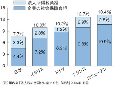 先進国との比較では、日本の総医療費は低く(図3)、企業の社会保障負担も低い(図4)のが実情。