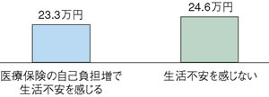 内閣府が七月に公表した二〇〇九年度経済財政報告(経済財政白書)では、社会保障制度と貯蓄の関係について調査。年金制度では老後に関して「非常に心 配」と回答した人が、そうでない人よりも年金支給時に必要と考える貯蓄額が一九八万円も多く、医療制度でも「医療保険の自己負担増で生活に不安を感じる」 と回答した人の月間消費(二三万三〇〇〇円)は、感じていない人の月間消費(二四万六〇〇〇円)よりも九〇〇〇円低かった(図5)という結果でした。