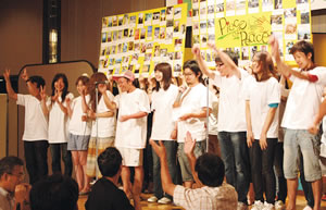 チャリンコ隊とバス隊二九人で参加した田村嘉織さん(29)=福岡・千鳥橋病院看護師=は「“平和と感じるとき”を撮った写真を募集し、タペストリーに して持ってきました。世界大会に参加して、本当に、世界は核兵器廃絶の流れになっているんだと実感しました」と。