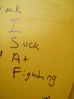 | バグラム基地の便所の落書き。ISAF(国際治安支援部隊)にひっかけて、「戦いにはうんざりだ」と書いてある |
