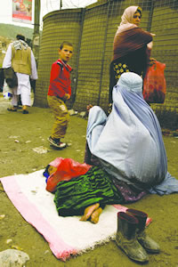 | ブルカを着た女性が道行く人に物乞いしていた。戦争で夫を失うとほかに生きる道はない(カブール) |
