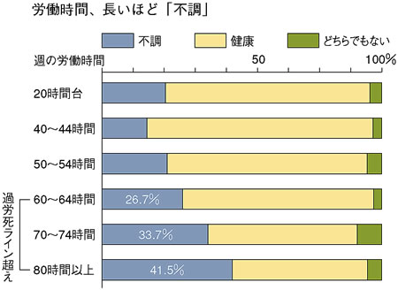過労死の危険がある週六〇時間を超えて働いている(月の残業八〇時間以上にあたる)人は一八・五%も。「体調が悪い」と答える割合は、労働時間が長い人 たちほど、高くなっていました。週五〇時間以上働いている人は二割を超え(二一・四%)、週八〇時間超えの層になると四一・五%にも(グラフ)。