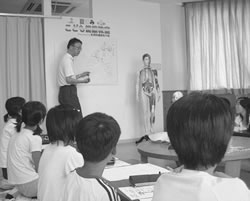 健康友の会と吉祥院こども診療所の毎年恒例の夏休み企画、今年は八月二〇日に。校長でもあるこども診療所今井所長の、人体模型を使った説明のあと、色鉛筆を使って、肺や心臓に色を塗り、自分だけの人体模型用紙をつくったり、聴診器で自分の心臓の音を聞いたり。