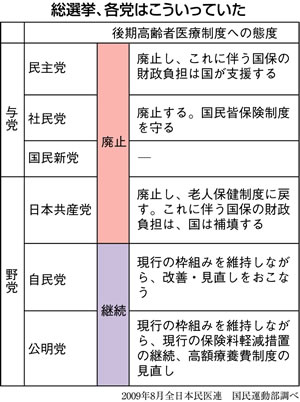 八月三〇日、総選挙・開票速報のテレビ番組。フラッシュを浴びながら「後期高齢者医療制度を廃止したい」と、当選の抱負を語った民主党議員がいました。 国会の過半数を「後期高齢者医療制度廃止」を掲げた議員が占めた…ここまで動かしてきた、と私たちの力を感じた瞬間でした。