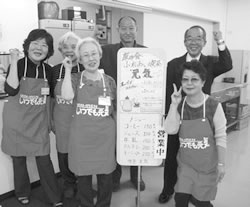 開店日には「元気」のエプロンをつけて、元気いっぱいお客さんを迎えました。初日は四〇人近くで大わらわ。「おいしかったよ」の声に励まされながら、がんばります。
