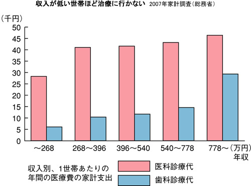家が貧しいため働きながら定時制高校に通っている高校生は一九本が虫歯。二〇〇〇円ずつ支払うことで治療をはじめたものの中断。その母親も虫歯でほとん ど歯がない状態で治療できずにいました。一家の大黒柱が非正規雇用のワーキングプアで、夫・妻、〇~七歳の子ども四人の一家全員が口腔崩壊状態だった事例 も。