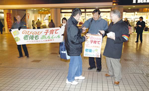 この日、二〇〇一年一〇月から毎月途切れることなくおこなってきた駅頭宣伝が一〇〇回に。「安心して、いつでも、どこでも、お金の心配なく医療を受けら れるように」。この願いで、当医療生協の事業所がある宇治市と城陽市、隣接市の二一駅を、各地域の組合員さんや他団体と協力し、宣伝して回ってきました。