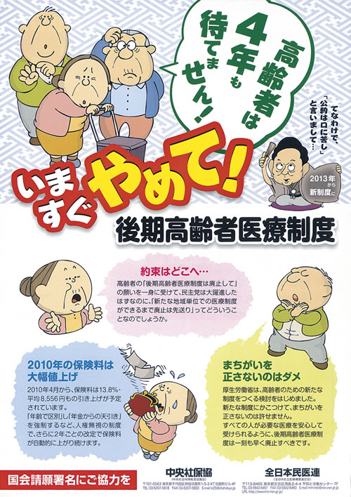「後期高齢者医療制度廃止」呼びかけの署名は、京都府保険医協会会長と、近隣の宇治徳洲会病院、第二岡本総合病院、宇治病院の各院長と、医療生協・あさくら診療所所長が連名で独自に作成。宇治市の全老人クラブ会長に発送しました。
