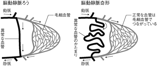 このようなかたまりがなく、つながっているだけのものを動静脈ろうといいます。これらの病気は動脈と静脈の間にあるはずの毛細血管がないため、動脈と静 脈をつなぐ部分に直接血液が流れ込んで圧迫され、血管が破れやすくなり、くも膜下出血の原因となります。