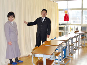 | カーテンで仕切られた特別支援学校の教室を視察(都内) |