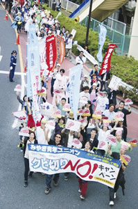 | 「ナットクできない、派遣法『改正』!とりもどそう!働くよろこび、生きる希望」をスローガンに、東京・明治公園に5200人の青年たちが集まった (5月16日 全国青年大集会2010) |