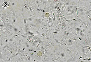 | 白い矢印の先がピロリン酸カルシウムの結晶 |