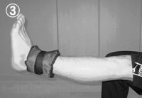 | 大腿四頭筋訓練(いすに座り、5秒間で1回、脚を持ち上げる。1日20回。0.75Kgをマジックテープ付きのベルトで固定) |