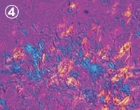 X線では、半月板の石灰化はなし。後日、関節液を詳しく調べると痛風特有の針条結晶(写真4)が。患者さんに見せると…。