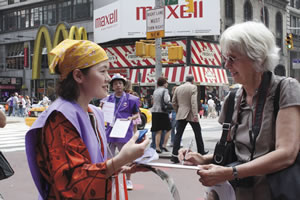 | 署名行動をおこなう長崎民医連の仲間。被爆地の思いは海をこえて伝わった(5月2日、タイムズスクエア) |