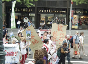 日本人だって負けていません。目を引いたのは和太鼓。どうやって持ち込んだのかわかりませんが、リズム感があって注目度バツグン。私たちもお祭り気分 に。日本のように「うるさい」などと野暮なことをいう通行人は皆無です。音を出して当然という雰囲気で、日本と大違い。次にニューヨークに来るときは、絶 対音の出るグッズが必要だと思いました。「デモ行進」ではなく「パレード」ですから。
