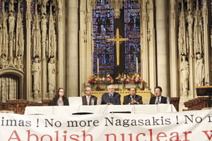 | エジプト軍縮大使、米、英NGO関係者を招いた、日本原水協主催の公開シンポジウム(5月3日、リバーサイドチャーチ)。米反核活動家のガーソン氏(中央)は「日本の平和運動は常に世界の導きの星…」と |