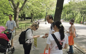 私たち滋賀の代表は五月二日午前、セントラルパークで英文の核廃絶国際署名行動にとりくみまし た。なれない英語で不安もありましたが、参加した滋賀民医連の仲間は「日本より署名してくれる人が多い」「しっかり署名内容に目を通してから署名してくれ る」「断る時も目をみて意志表示され、さわやかだった」と。いい経験になりました。