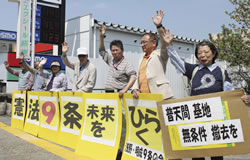 憲法記念日に「浅野明成九条の会」は、恒例の「サイレント宣伝」をおこないました。米軍基地問題が焦点となった今年は、「普天間基地無条件撤去を」のボードを追加してアピール。