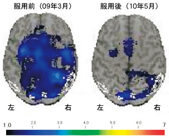 図2はアリセプトを1年間使用したことで、症状が改善した64歳男性の脳SPECT画像です。脳内の血流が回復しているのがわかります。