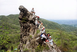 村議会議員をしている奥谷和夫さんが、熱意ある親切なガイドをしてくださり、参加者はみんな満足しました。直径七メートル、重さ六〇〇トンの長寿岩、海 抜六一八メートルの神野山頂上からみる新緑の山々、ツツジが咲き乱れる山はだ、巨岩が数百メートルにわたってころがる天然記念物、傾斜地には新茶の畑群。