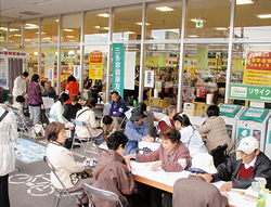 事前にお店の周辺住宅地などに三〇〇〇枚のチラシを配って宣伝。当日は、医師、看護師、管理栄養士、友の会スタッフなど一六人が、体脂肪や血圧の測定、医療相談や栄養相談などに応じました。