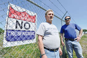 | 工場跡地には「立ち入り禁止」の看板。「若いころ、バイクで土煙を上げながらこの広場を走り回ったんだ。だから劣化ウランの粒子をたくさん吸い込んでしまった」と近所に住んでいたジョセフ・リトさん(右、46)。左がトニーさん |