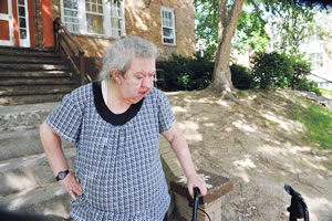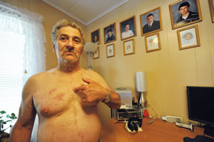 | トニーさんはNLIに隣接した家から隣町へ引っ越したが、関節痛で正常に歩けない。心臓手術跡が痛々しい |