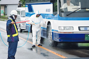 | 川南町の周辺道路で念入りな消毒。取材陣の乗った車も数回消毒を受けた |