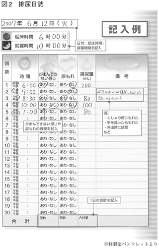 ■排尿日誌 患者さんは診察室で、ご自身の排尿状況についてさ まざまな訴え方をされます。排尿は順調かどうかという意味で「尿はよく出ていますか?」とたずね、「よく出ています」と答えられれば、医療者側としては 「ああ、尿の出は困っていないのかな」と考えます。ところが「もう嫌になるくらいしょっちゅう出ています」と続く方もいます。