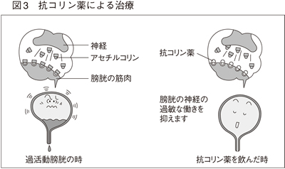 ■薬 頻尿の代表的な薬に抗コリン薬(図3)があります。抗コリン薬は膀胱を収縮さる“アセチルコリン”という物質の働きをブロックすることで膀胱の過敏な収縮を抑えます。その結果、先程お話しした膀胱の異常な収縮=尿意切迫感を落ち着かせ、過活動膀胱の症状を改善します。