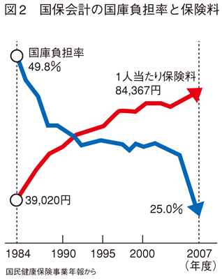 一般会計からの繰り入れを問題にするなら、本来は国保への国庫負担を元に戻すことが先決です。国保への国庫負担は一九八四年は四九・八%でしたが、二〇〇七年には二五・〇%にまで引き下げられています(図2)。