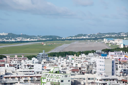 | 宜野湾市の中心を占有する米軍普天間基地。住宅・公共施設の密集地にあり、「世界一危険な飛行場」と呼ばれる |
