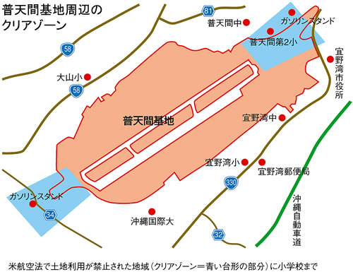 さらに伊波さんは「普天間基地は飛行場ではない」と指摘します。住宅密集地にあるため、日米いずれの航空法にも違反しているからです。ことし七月、福岡 高裁が「世界一危険な飛行場」と認定したゆえんです。法律違反のため、民間機は着陸できません。米航空法では離発着時の安全確保のため、土地利用が禁止さ れた区域(図)を設定していますが、そこに公共施設・保育所・病院が合計一八カ所、住民三六〇〇人が居住しています。