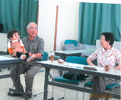 「ゆう太、今日は『元気』販売所の交流会におじゃましたよ。ご挨拶は?」と、腹話術の友の会員さんも登場した販売所交流会。先日、『元気』編集長を招いておこなった学習会のようすと映像の紹介がありました。