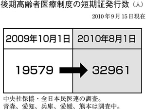 中央社会保障推進協議会と全日本民医連が共同でおこなった短期証発行数の調査では、四一都道府県一万九五七九件(〇九年一〇月)から三万二九六一件(一〇年八月)に増えていたことがわかりました。