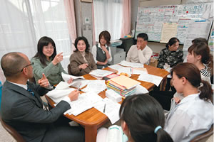 「患者さんの小さなシグナルを見落とさないように、職員は人権のアンテナを敏感にすることが大切」と考えていた亀本事務長。カンファレンスを五月から実 施し、七月からは隣接する在宅介護支援センターのソーシャルワーカー・栄美夕紀さんも参加。「気になる患者さんがいたら、みんなで情報を共有し、患者さん の力になろう」という気風が生まれます。
