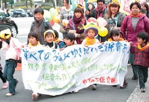 | 11月14日に開かれた集会後のパレード(上)/会場には“公的保育の充実を”“市場化反対”のプラカードや横断幕が(下) |