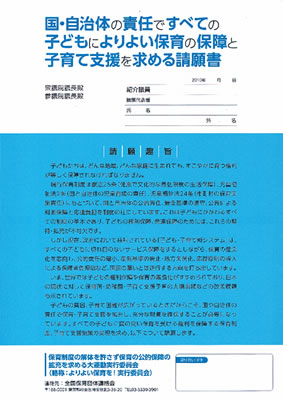 集会を主催した「保育制度の解体を許さず保育の公的保障の拡充を求める大運動実行委員会」は、現行制度のもと、国・自治体の責任で保育所を増設し、すべての希望者に保育を保障することなどを求めて国会請願署名にとりくんでいます。
