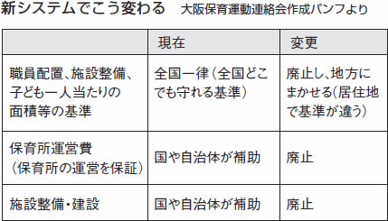 これまでは、国が設ける職員数と設備や施設の基準を一定以上満たすことで、保育の質や水準を確保していました。「新システム」は、幼稚園と保育所を一体 化させ、「こども園」と名称を変更。運営に企業も参入できるように国の基準をなくすものです。自治体は「要保育度」を一人ひとりの子どもについて審査し て、必要な保育時間を認定するだけ。保護者は、その「要保育度」に応じて、保育を受け入れてくれる「指定事業者」を自分の足で探し回り、指定事業者と個別 に契約を結んで保育料を支払うという「直接契約制」のしくみです。