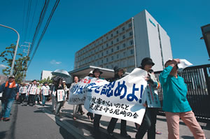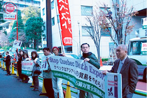 | ケベック州(カナダ)でアスベスト鉱山再開の動きが。途上国への輸出に抗議する被害者たち。「日本政府も抗議してほしい」と、泉南訴訟の原告(2010年12月7日、ケベック州駐日事務所前) |