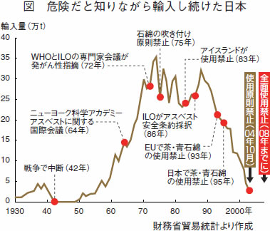 日本政府がアスベストの使用を全面的に禁止したのは二〇〇六年。人体への有害性は、一九六四年に発表されていました。WHO(世界保健機構)と ILO(国際労働機関)の専門家会議が発がん性を指摘したのは七二年、国会でも日本共産党の衆院議員が質問しています。またILOは、八六年にアスベスト のなかで最も毒性の強い青石綿の使用や、吹付け作業を禁止するなどの条約を採択しましたが、日本の批准は〇五年七月。二〇年近く安全対策を放置したばかり か、通算一千万トンの大量輸入を続けたのです(図)。アスベストを使った建築資材も使用を義務づけていました。