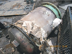 解体される船舶の壁やボイラー・エンジン部分に、断熱材としてアスベストが使われています。解体現場には、ボイラーの一部らしき金属部分に、アスベストとみられる断熱材が巻き付いたままでした。また、剥がされたアスベスト状の繊維もあちこちに散乱していました。