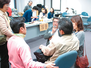 | 年末拡大相談会」で相談にのる大葉さん(中央奥の男性)らボランティア・スタッフ |