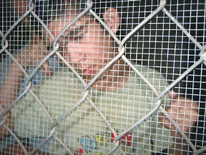 | 農作業などで忙しい家庭では障がい児を見る余裕がない。1日を金網の中で過ごす子どもも |