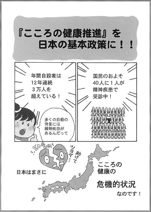 いま、私たち「こころの健康政策構想実現会議」(以下、「実現会議」)は「こころの健康を守り推進する基本法」の制定を求める署名にとりくんでいます。 わが国の精神疾患は、WHO(世界保健機関)が提唱する指標(D・LY)を用いると、がんや、心筋梗塞・脳卒中などの循環器の病気を抜いてトップです。 「実現会議」はこの現実から、(1)精神疾患を3大疾病のひとつとして位置づけ、国の重点施策にすること、(2)国民のすべてを対象とした、こころの健康 についての総合的で長期的な政策を保障する「こころの健康を守り推進する基本法」の制定の2点を国に求めて、100万人を目標とする署名活動を展開してい ます。