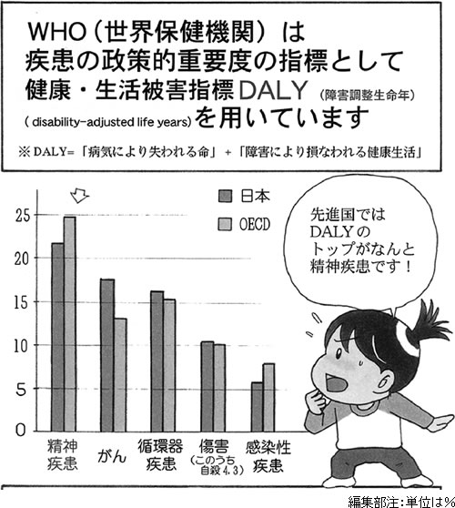 厚労省が提言する「健康日本21」でも、生活習慣病が中心で、「精神保健」はその治療の一環とされ、従属的な扱いです。こころの健康が大きな問題となっているのに、優先順位は低いままなのです。