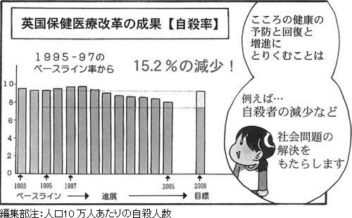 わが国の自殺率は人口10万人に対して24.8人(2010年速報値)ですが、イギリスでは7.8人(2005~2007年の平均値)となっており、9年間で15.2%減らすことに成功しています。