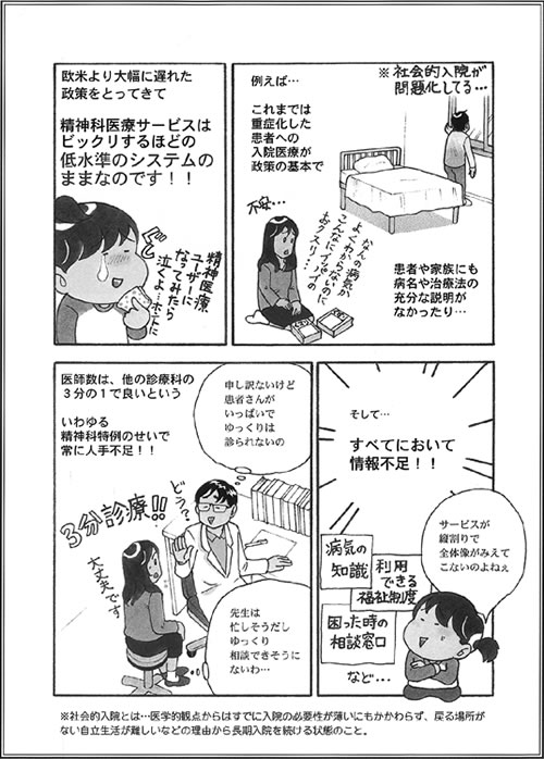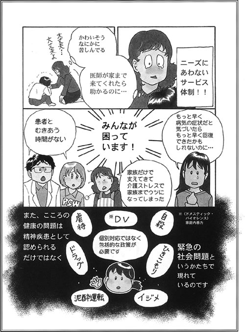 約33万の入院患者さん・ご家族の多くは、こころの病のために人生を失っていると言っても、言い過ぎではありません。日本の精神病対策は世界的に見ても はるかに遅れています。私は患者さんや家族の声に真摯に耳を傾けて、その声にこたえる医療をどうつくりあげるのか、いま真剣に考えなければいけないと思い ます。治療スタイルも、これまでの「病院での診療」から「病院に来られない患者さん宅を訪問する」ものへと大きく変える必要があるでしょう。